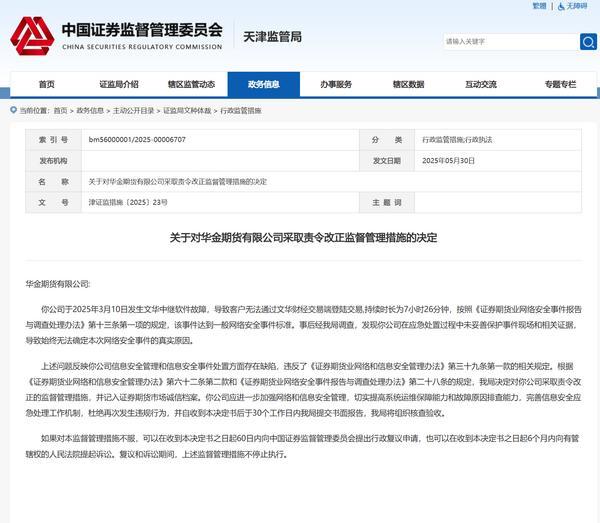 天津证监局吐露,上述题目响应华金期货新闻和平处置和新闻和平事宜办理方面存正在缺陷,违反了《证券期货业搜集和新闻和平处置手腕》第三十九条第一款的相干规则。依据《证券期货业搜集和新闻和平处置手腕》第六十二条第二款和《证券期货业搜集和平事宜通知与考核处置手腕》第二十八条的规则,天津证监局定夺对华金期货选取责令厘正的监视处置步骤,并记入证券期货墟市诚信档案。华金期货应进一步加紧搜集和新闻和平处置,确实进步体系运维保证本领和障碍出处排查本领,完满新闻和平应急处置事情机制,杜绝再次产生违规作为,并自收到本定夺书后于30个事情日内向天津证监局提交书面通知,天津证监局将构制核检查收。
