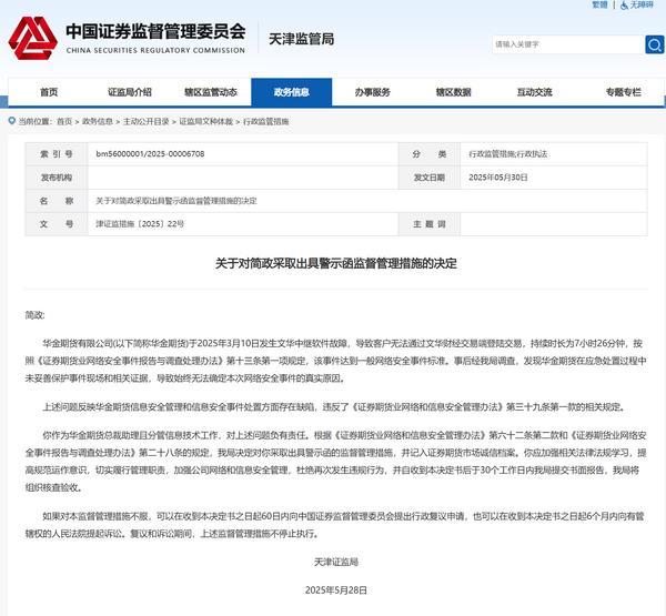 同时,简政行动华金期货总裁助理且分担新闻技艺事情,对上述题目负有仔肩。依据《证券期货业搜集和新闻和平处置手腕》第六十二条第二款和《证券期货业搜集和平事宜通知与考核处置手腕》第二十八条的规则,天津证监局定夺对你选取出具警示函的监视处置步骤,并记入证券期货墟市诚信档案。你应加紧相干法令原则研习,进步典范运作认识,确实实施处置职责,加紧公司搜集和新闻和平处置,杜绝再次产生违规作为,并自收到本定夺书后于30个事情日内向天津证监局提交书面通知,天津证监局将构制核检查收。