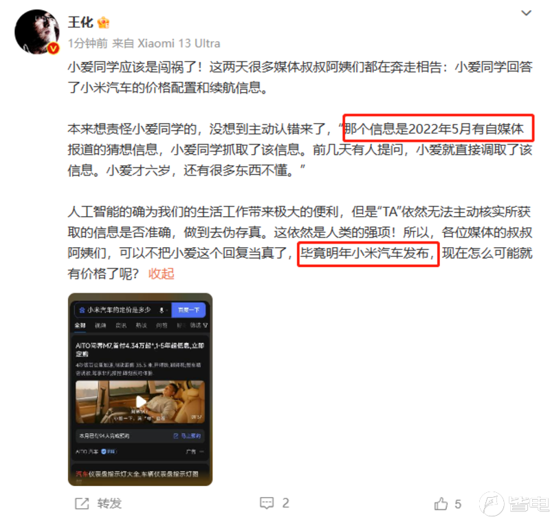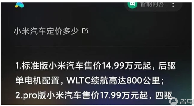 小米公闭担负人王化吐露:这是小爱同砚通过检索征采引擎音讯给出来的谜底,本质上14.99万元这个数字和800续航是2022年5月有自媒体报道的猜度音讯,被小爱同砚抓取到。