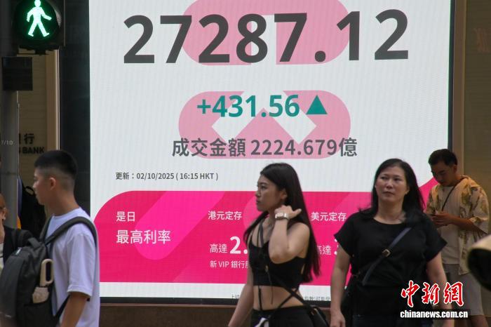 10月2日,香港恒生指数收市报27287.12点,上升431.56点,升幅为1.61%,终日成交金额为2224.68亿港元。中新社记者陈永诺摄