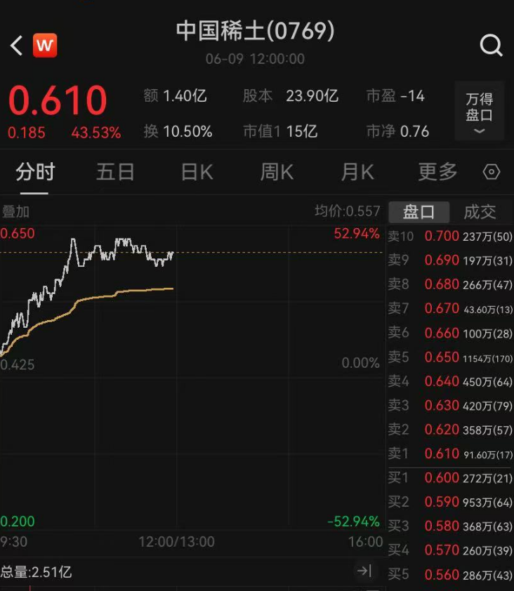 港股中邦稀土暴涨,盘中涨幅一度凌驾50%,截至午间歇盘,涨幅收窄至43.54%,成交额较此前贸易日光鲜放大。