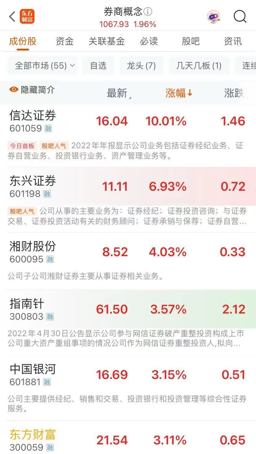 早盘,大金融板块颠簸拉升,券商板块短线迅疾拉升,信达证券盘中涨停,东兴证券、中邦银河、光大证券等涨幅居前。