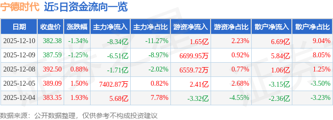 同比上升12.9%;单季度归母净利润185.49亿元2025年12月12日证券之星讯息,截至2025年12月10日收盘,宁德时间(300750)报收于382.38元,下跌1.34%,换手率0.46%,成交量19.43万手,成交额73.99亿元。