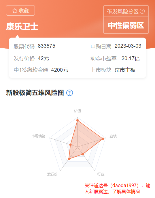 当然,正在这两只个股申购前,【新股雷达】就对他们定为了“中性偏弱区”,兴味即是其上市首日的涌现不妨会偏弱。而最终涛涛车业上市首日跌幅达20.14%,康乐卫士上市首日跌幅达15.42%。