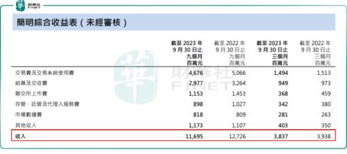 正在如许低迷的墟市浮现下,港交所2023年前三季主开业务总收入同比降落8.1%,至116.95亿港元,个中2023年第3季的收入按年降落2.6%,至38.37亿港元。生意费、上市费、结算费和交收费以及存托和代办人收入的降落,齐全抵消了墟市数据费收入的微增。