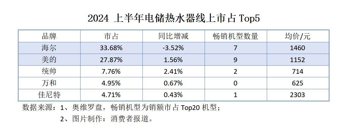 从电储热水器和燃气热水器的线来看,海尔和美的结成第一阵营,它们两家具有较众的抢手机型,断档式领先。此中美的热水器的市占爬升显着。从各品牌的产物均价来看,统帅、万和的电储热水器主攻中低端商场;佳尼特的电储热水器和林内的燃气热水器主攻中高端商场。