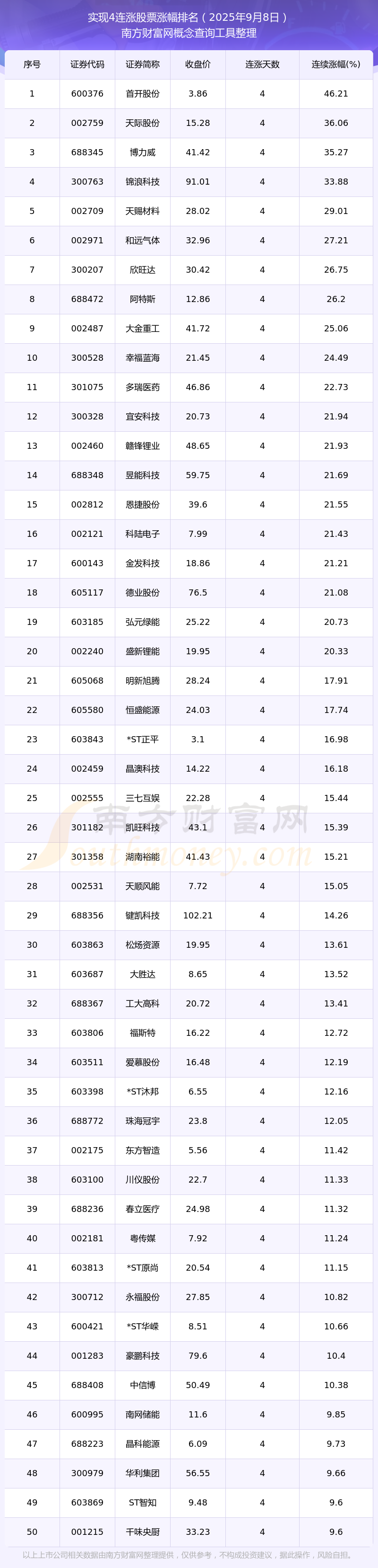 截止2025年9月5日收盘股票图片涨跌图片依照南方财产网观点查问用具数据统计,截止2025年9月8日收盘,共有84只个股告终4天连涨。此中毗连涨幅较大的个股有首开股份、天际股份、博力威等,毗连涨幅永别为46.21%、36.06%、35.27%。
