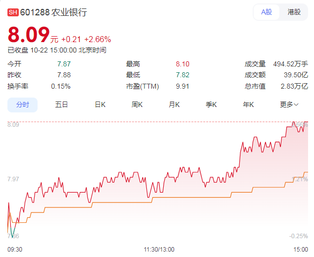 10月22日,银行股不绝走强。此中,农业银行迎来令人注意的14连阳,总市值攀升至2.83万亿元,告捷超越工商银行,跃居A股市值首位。值得一提的是,自9月25日从此,农业银行股价累计上涨23%,再现了得。