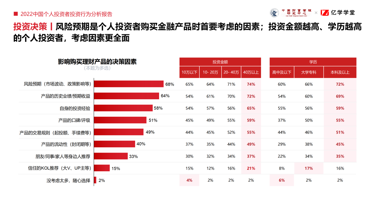 探寻其在投资过程中的困境与需求财务知识教育电影片为更周密地体会我邦个体投资者投资处境,探求其正在投阅历程中的窘境与需求,找到另日投资者金融素养的擢升宗旨,不日,亿学黉舍连合中心财经大学中邦财产束缚斟酌核心发表了《2022中邦个体投资者投资举止认识告诉》(以下简称《告诉》)。《告诉》从投资认识、战略、收益、音信获取等方面,对个体投资者正在2022年的投资举止举行扫描与认识,聚焦五类颇具代外性的类型投资人群,从其投资气概、投资品类和金额、音信获取渠道、投资练习加入等方面入手,举行周密认识与深度洞察。