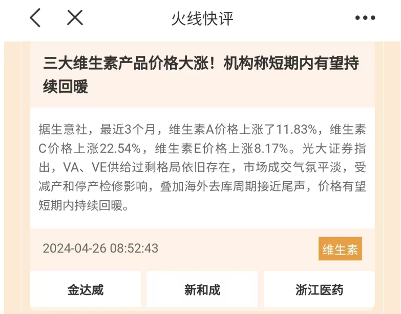 别的,少少选手应用逐日经济音讯APP个人订制的“前哨速评”也捉住了市集机缘,例如他们捉住了维生素板块的浙江医药。