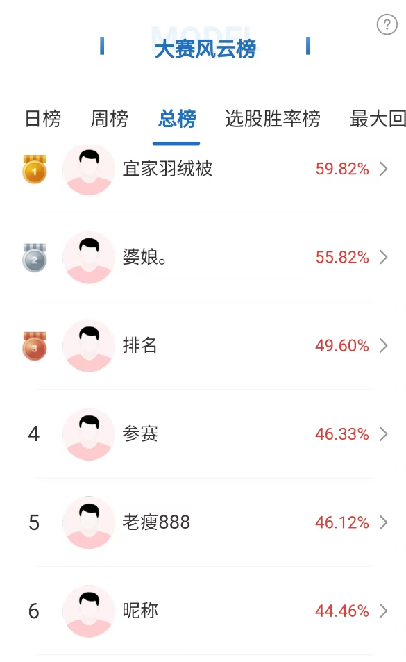 本期逐鹿中,冠军收益率59.82%,亚军收益率55.82%,季军收益率49.60%。共有431名选手得到正收益,正收益选手都将获取现金赞美。第1名现金赞美1888元/人(税前),第2至第4名现金赞美688元/人(税前),第5至第10名现金赞美288元/人(税前);其他收益为正的选手均分1000元现金奖池(税前)。