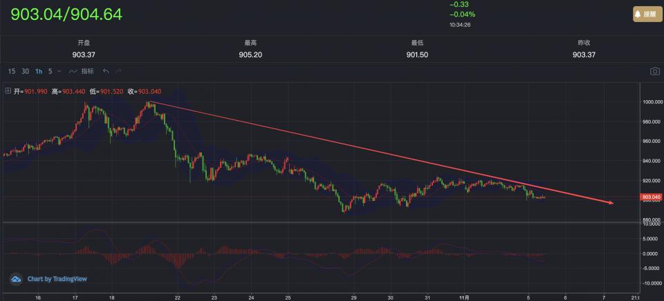 过去两天代价都正在905—910区间再三震撼,目前已向区间下沿亲切,若跌破900,恐触发进一步回落。
