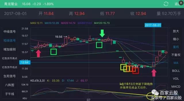 案例2.青龙管业(002457)正在本年七月被曝出利空,随即股价显露了一波相连跌停并正在其后一连颤动下行。正在月底企稳后于8月1日显露百家云股APP短线信号买入提示,KDJ底部金叉,KDJ冲破降落趋向的三重信号共振。正在三重信号共振发出后,该股相连两日跳空涨停,上涨幅度高出20%。