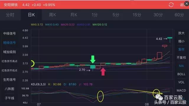 案例3.安阳钢铁(600569)正在本年7月受益与钢铁涨价题材驱动显示强势,并于7月19日显露KDJ低位金叉信号,随后百家云股APP给出短线信号买入提示。正在股价处于赤色箭头短线信号强势区间,该股资历了一段高位盘整并于8月2日再次显露KDJ金叉,且同时冲破降落趋向压制。正在随后的两个生意中,该股涨幅一度高出15%。