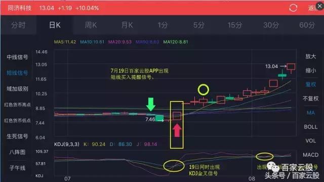 案例1.同济科技(600846)受益于雄安制造风口,正在7月19日显露百家云股APP的短线买入指引信号,随即当日涨停并显现KDJ金叉的本事形状。该股随后正在第二个生意日缩量封死一字板并正在其后的几个生意日中不停颤动向上盘升。正在短线信号不停庇护众头区域的期间里,于8月2日再次显露kdj粘合金叉,随后股价三个生意日再次上涨超20%。