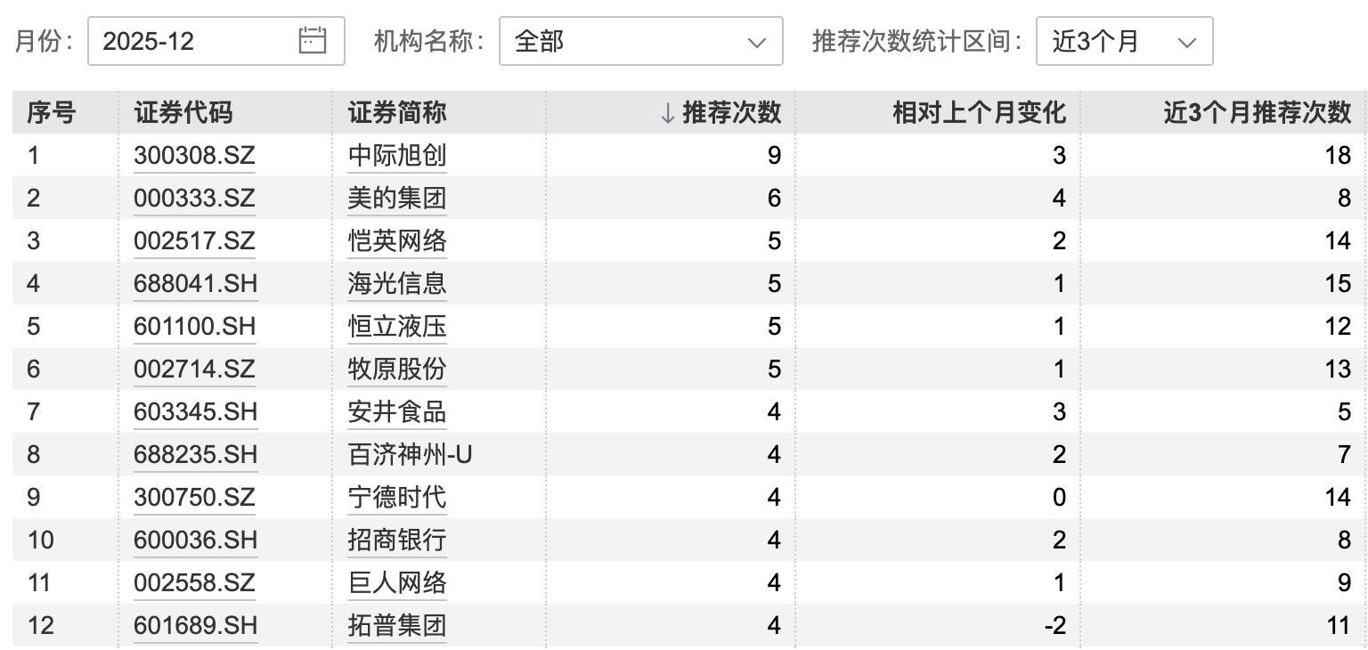 Wind数据显示,截至12月3日午时,已有36家券商揭橥了12月金股引荐,共计引荐226只股票。正在12月金股引荐榜中,中际旭创被引荐次数最众,被9家券商同时引荐,其近三个月被引荐次数到达18次,自9月1日今后区间涨幅到达48.46%。紧随其后被引荐的是美的集团,其股价正在12月3日再创年内新高。