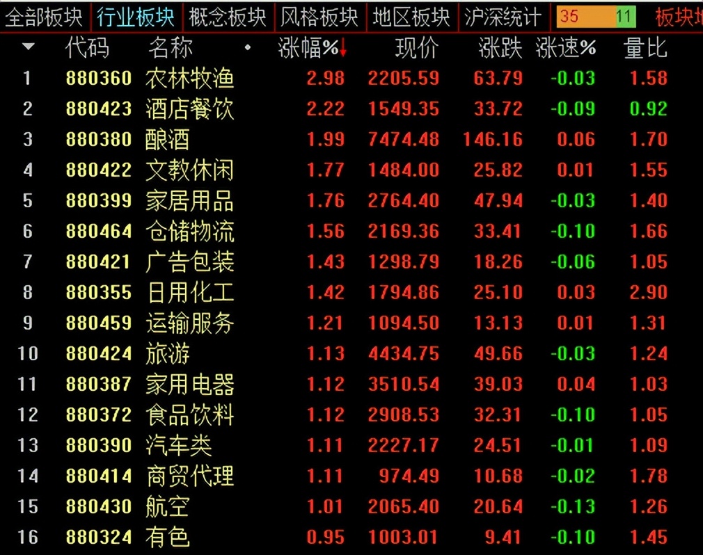 上午大盘探底回升,三大指数均小幅上涨。盘面上,贵金属板块大涨,金贵银业涨停,赤峰黄金创阶段新高。养殖板块颤动走强,天邦食物领涨。汽车整车股盘中异动,亚星客车涨停。另外一带一起、中药、白酒、油气等板块均有所活动,但大大都个股均冲高回落。具体上商场热门较为整齐,无非常强势的主线。下跌方面,CRO观念股重挫,康龙化成、药石科技跌超10%,凯莱英跌停。总体上个股涨众跌少,两市超2800只个股上涨。板块方面,贵金属、养殖、农业、汽车整车等板块涨幅居前,CRO、房地产、电力、TOPCON电池等板块跌幅居前。