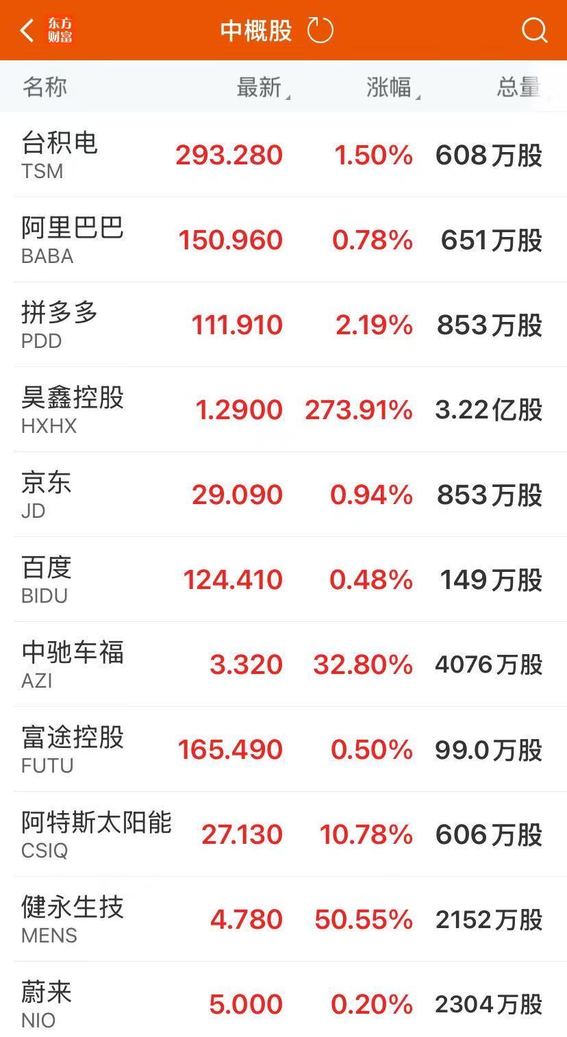 中概股大都上涨,纳斯达克中邦金龙指数涨0.53%。个股方面,阿特斯太阳能涨近11%,爱奇艺、奇富科技、小马智行、晶科能源涨逾2%;禾赛科技跌超3%,再鼎医药跌近2%,金山云跌逾1%。