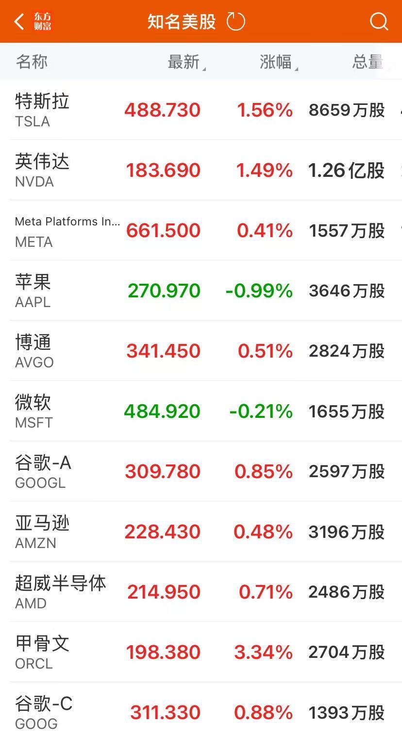 盘面上,大型科技股大都上涨,特斯拉、英伟达涨逾1%,谷歌涨近1%,亚马逊涨0.48%,脸书涨0.41%;苹果跌超1%,微软跌0.25%。