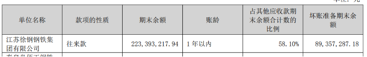按时末余额前五名的状况来看,来自徐钢集团的应收款余额为2.23亿元,占其他应收款期末余额合计数的58.1%,计提的坏账绸缪期末余额为8935.73万元。