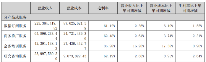 证券之星留神到,数据订阅效劳、商务推行效劳、查究接洽效劳的毛利率均正在60%以上,但过低的收入占比使其难以拉动事迹增加。