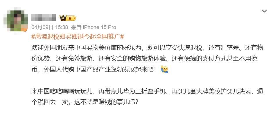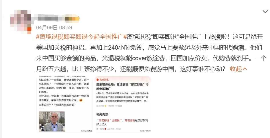 有网友以为,新计谋可以催生“中邦采购—局部率领—美邦转售”的新型商业链,堪称“稳赚不赔”的生意:“按新退税计谋,老外购物连忙就能拿到退税款,若采购商品金额可观,光退税就可以cover往返盘费,回邦加价售卖,代购费轻松入袋。有人乃至能全职干,每月众跑几趟,赚得比上班众,还能免费畅逛中邦。”