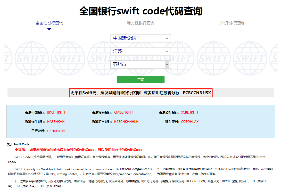 若是您所查问的都市没有只身的SwiftCode,可能行使省分行的SwiftCode。